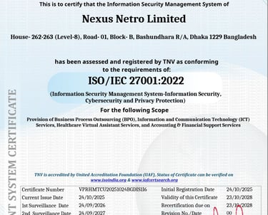 NEXUS Netro Limited is an ISO/IEC 27001:2022 certified and HIPAA-compliant BPO and ICT service provider from Bangladesh, delivering secure, scalable, and technology-driven outsourcing solutions to clients worldwide.