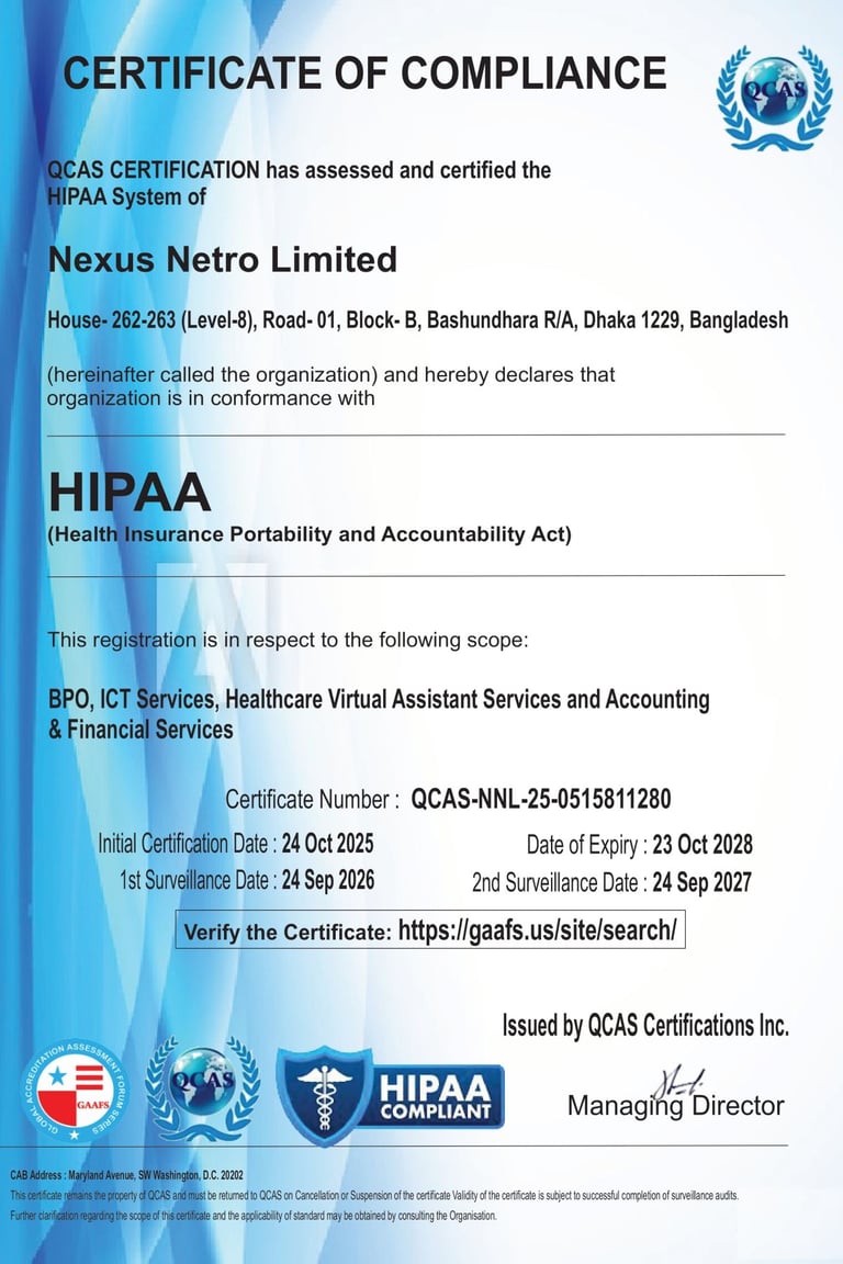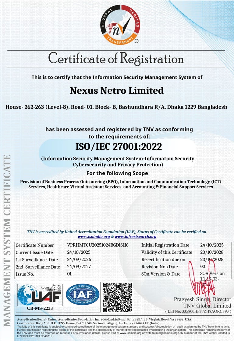 NEXUS Netro Limited is an ISO/IEC 27001:2022 certified and HIPAA-compliant BPO and ICT service provider from Bangladesh, delivering secure, scalable, and technology-driven outsourcing solutions to clients worldwide.